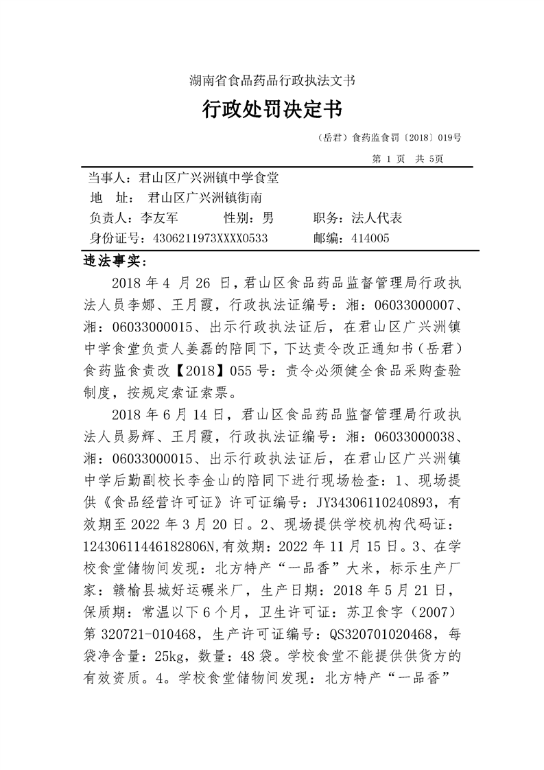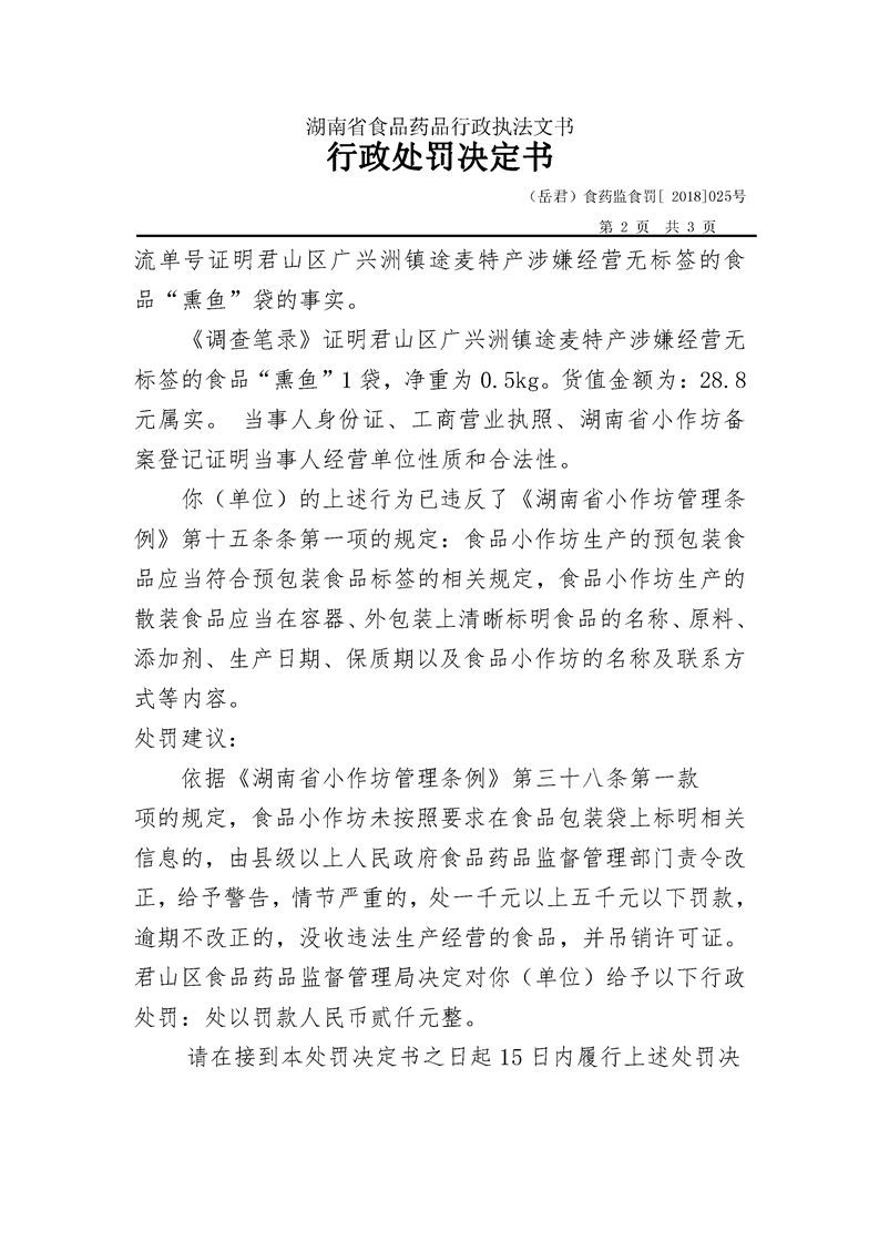 2018年7月份君山区食品药品行政处罚信息公开表及行政处罚决定书