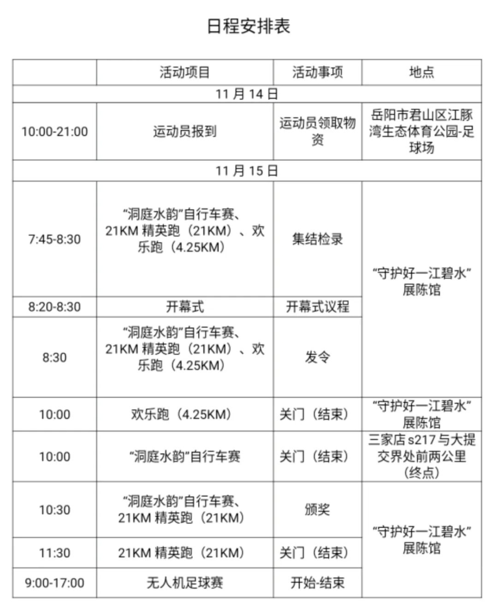1.参加“洞庭水韵”自行车赛项目的选手均可在开赛前30分钟寄存存衣包,组委会统一送到项目终点,完赛选手在各项目终点处凭号码布领取存衣包;参加21KM精英跑(21KM)项目的选手均可在开赛前30分钟寄存存衣包;欢乐跑(4.25KM)不提供寄存服务。