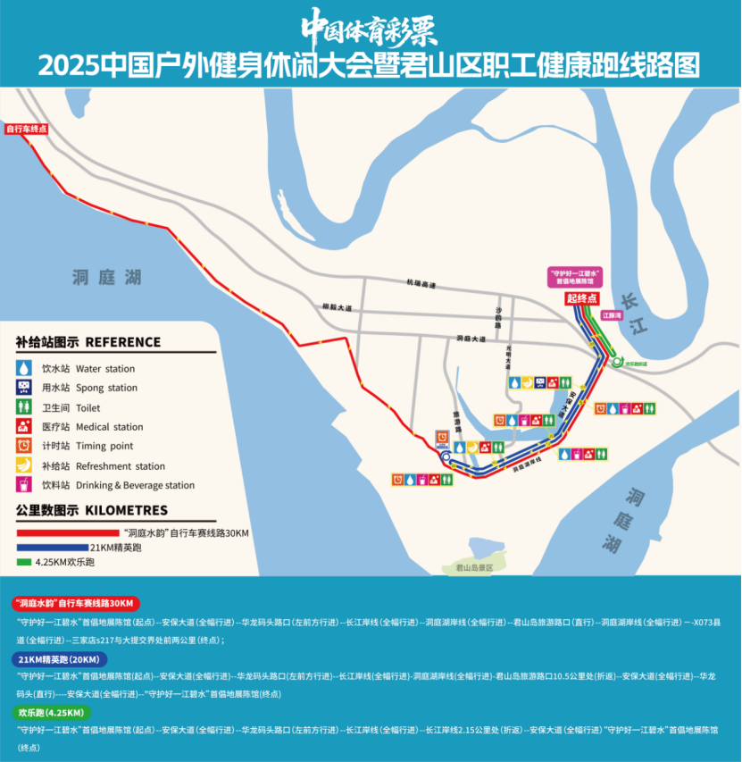 “守护好一江碧水”展陈馆(起点)--安保大道(全幅行进)--华龙码头路口(左前方行进)--长江岸线(全幅行进)--洞庭湖岸线(全幅行进)--君山岛旅游路口(直行)--洞庭湖岸线(全幅行进)--X073区道(全幅行进)--三家店s217与大提交界处前两公里(终点);