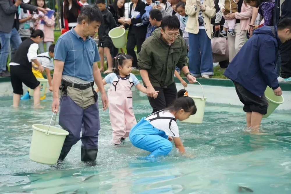 “浑水摸鱼”区域欢笑声不绝于耳。孩子们卷起裤腿、手提小桶,纷纷踏入水中,专注地寻找游动的鱼儿。“我抓到三条!”“我有五条!”童言稚语中洋溢着收获的喜悦。最终按鱼获重量评定名次,每个家庭还可将5斤以内的战利品带回家。这些鱼都是由君山生态渔业集团提供的生态鲫鱼。