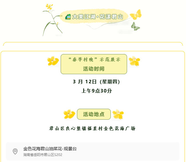 春风拂过洞庭岸,金浪翻涌醉君山。第十三届油菜花观赏季暨2026岳阳市“春季村晚”示范展示活动即将启幕!乡土欢歌如约唱响,“村晚”舞台搭在花海之间,藏着最地道的乡音、最真挚的乡情,邀八方宾客共赴春日盛宴。
