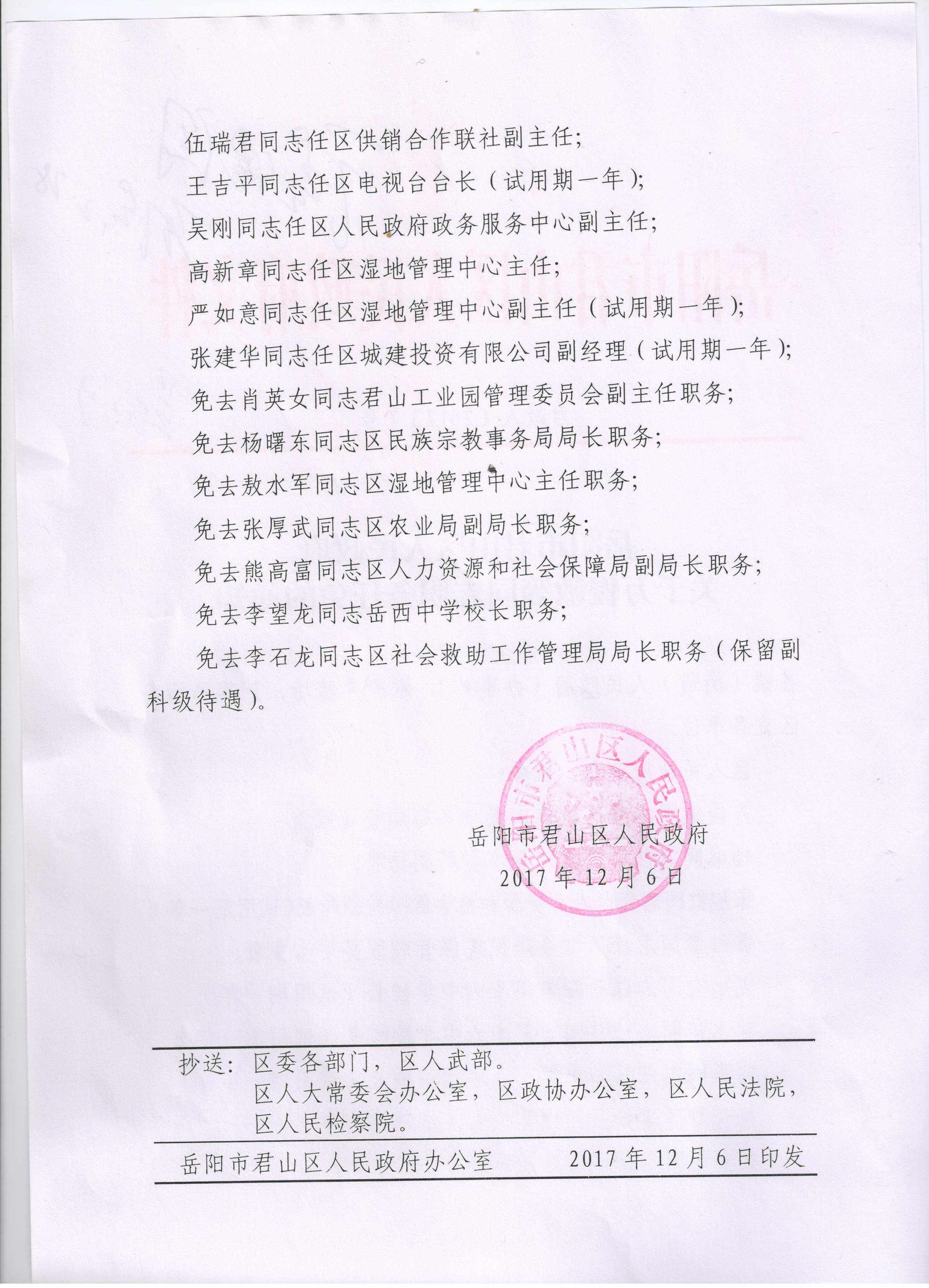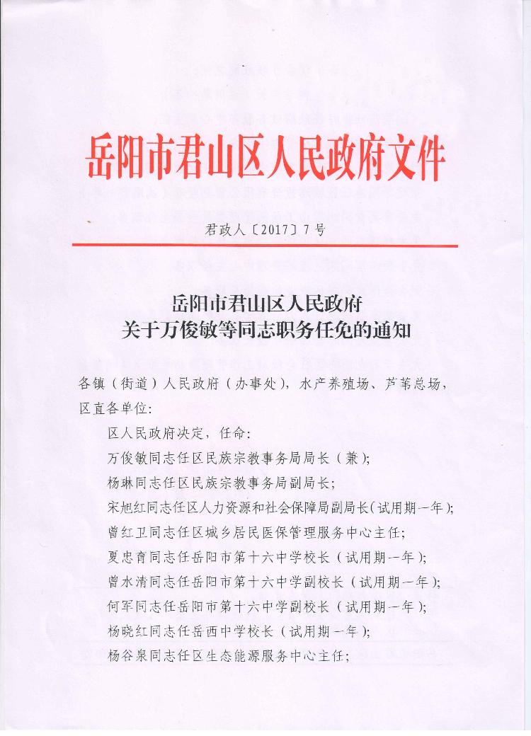岳阳市君山区人民政府关于万俊敏等同志职务任免的通知