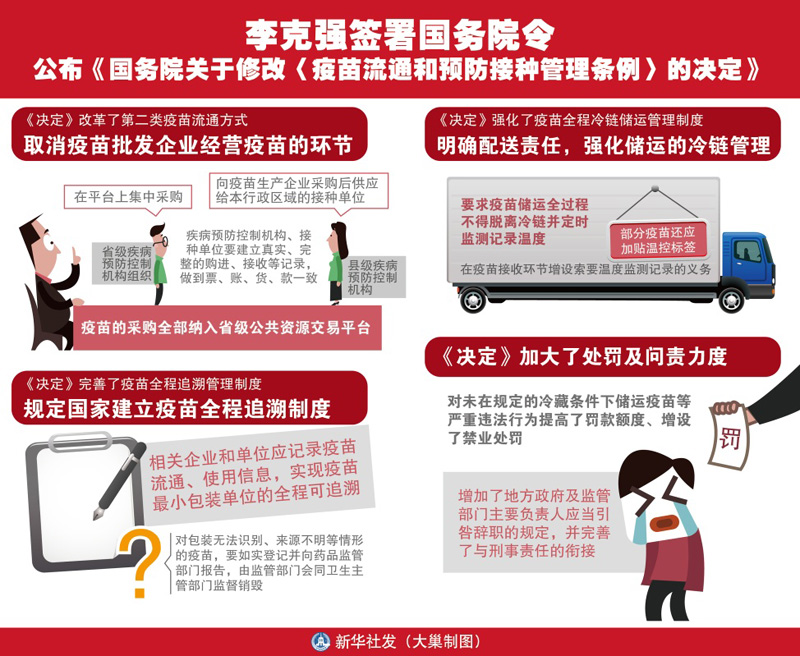 图表:李克强签署国务院令 公布《国务院关于修改〈疫苗流通和预防接种管理条例〉的决定》 新华社发 大巢制图