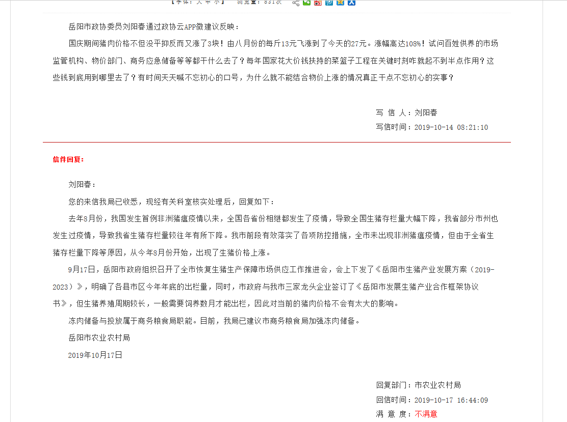 您好,您在市长信箱中再次反映猪肉价格上涨的信件我局已收悉,感谢您对我局工作的关心,现就有关问题回复如下:目前全国生猪平均价格都在小幅上涨,各地区震荡不一。猪肉市场供需僵持局面延续,养殖户惜售抵触情绪仍在,屠宰企业虽无采购难度,但市场压价难度较大,因此造成了市场上猪肉价格一再上涨。目前为了缓解生猪生产和市场价格周期性波动,由湖南省发改委联合五部门下发了《湖南省缓解生猪市场价格周期性波动调控预案》,将猪粮比价作为核心指标,当国家公布的猪粮比价连续一段时间处于某个区间时,由省发展和改革委员会牵头会商,提出省级冻猪肉储备投放计划,由省商务厅牵头组织实施。同时我局也制定了《岳阳市应对非洲猪瘟等突发事件确保中心城区猪肉市场供应的应急预案》,目前我局正按预案规定的职责分工做好市场监测、信息发布和冻猪肉储备工作。