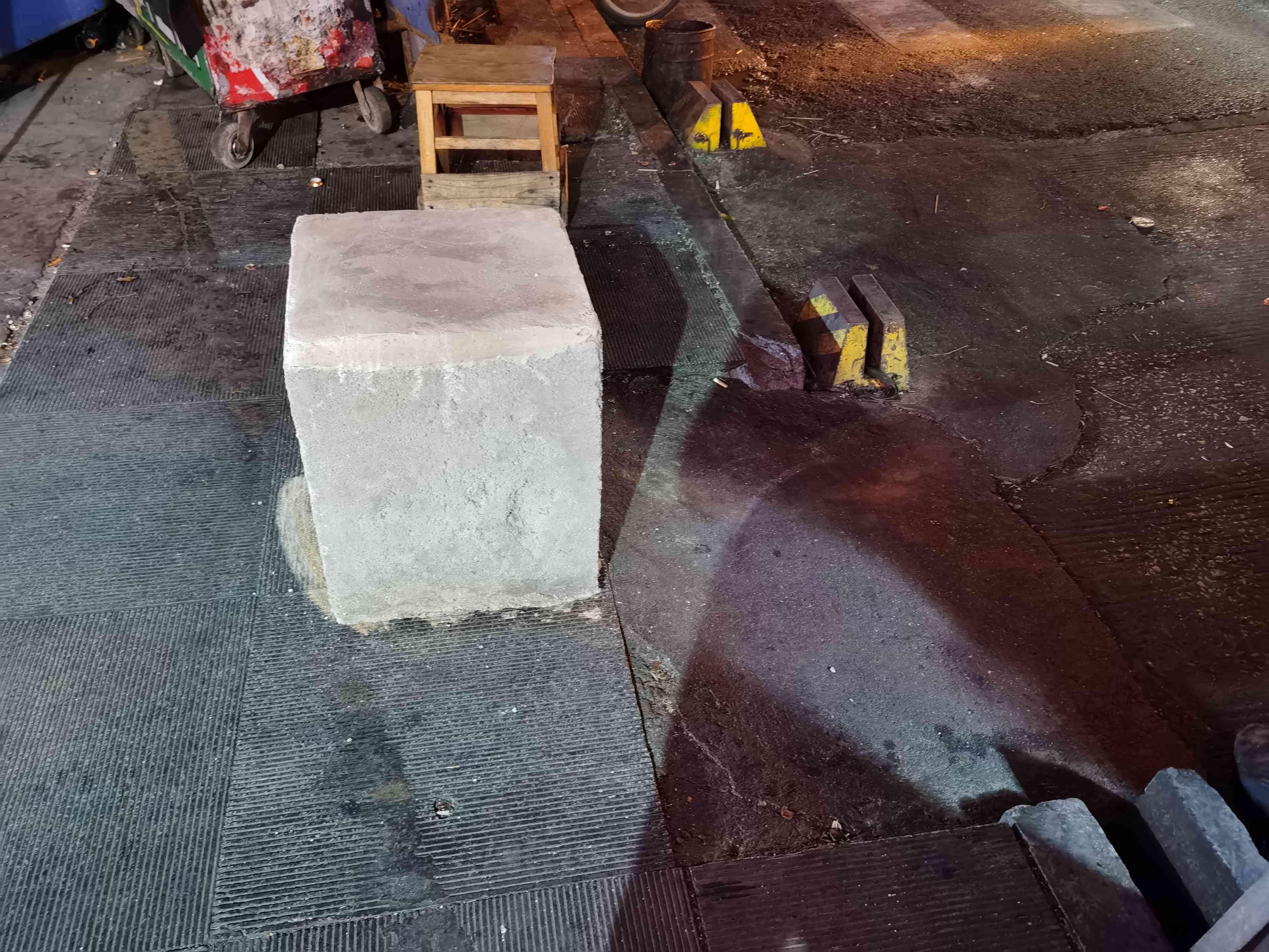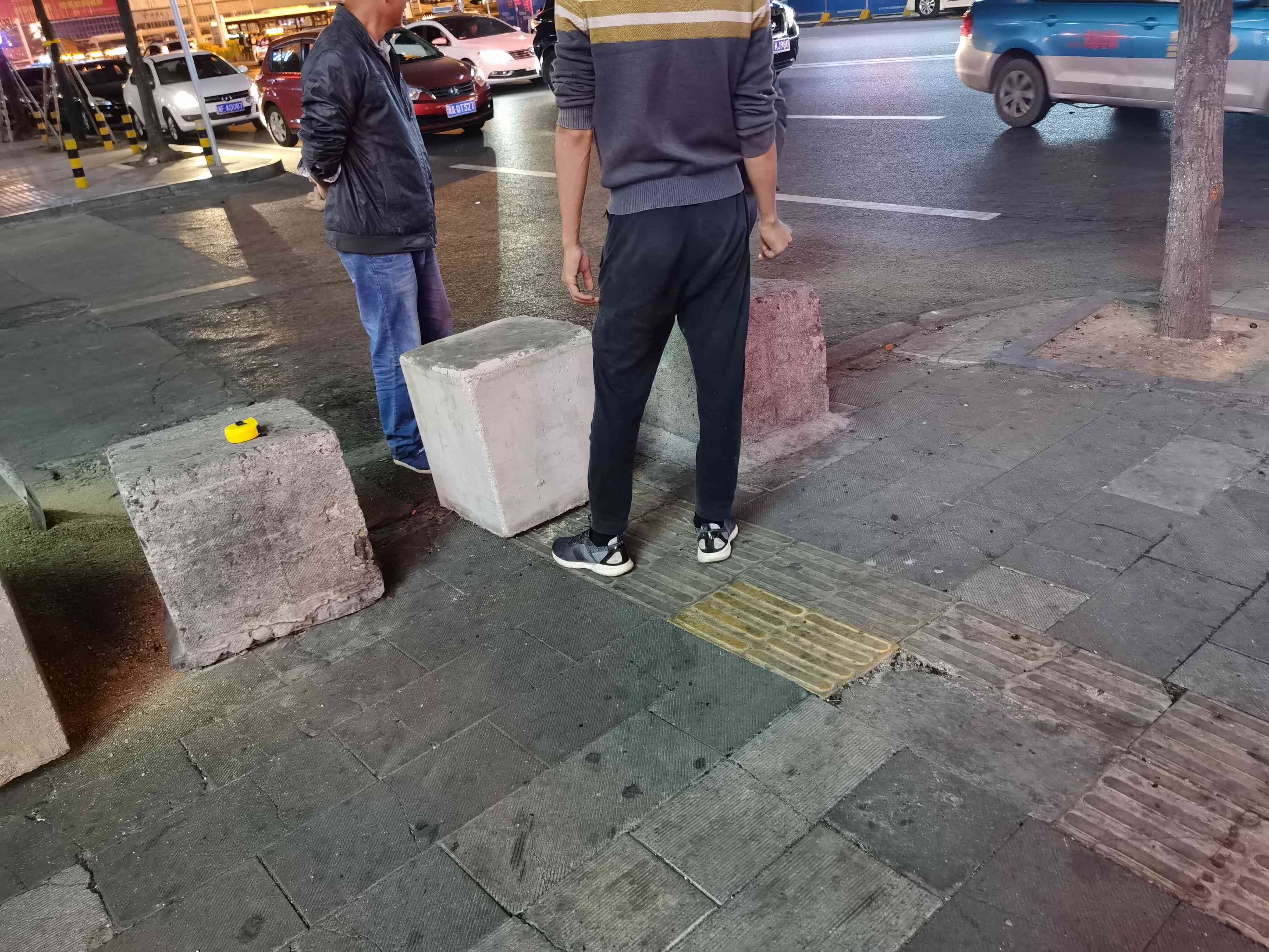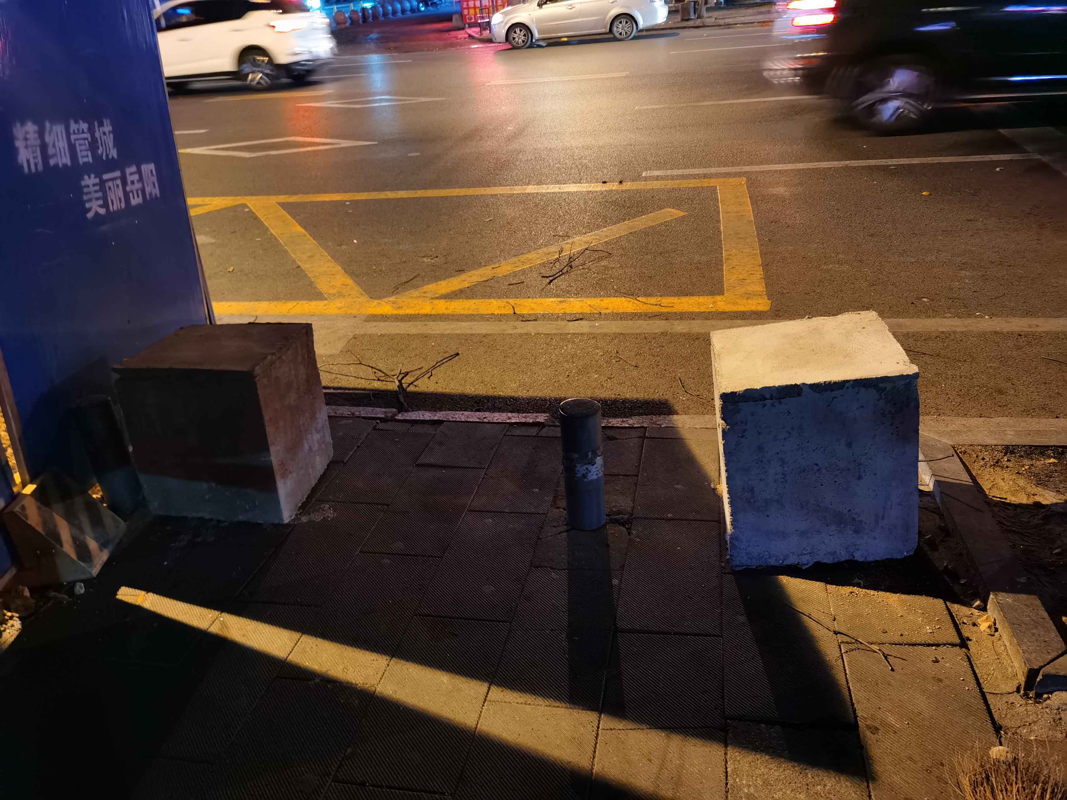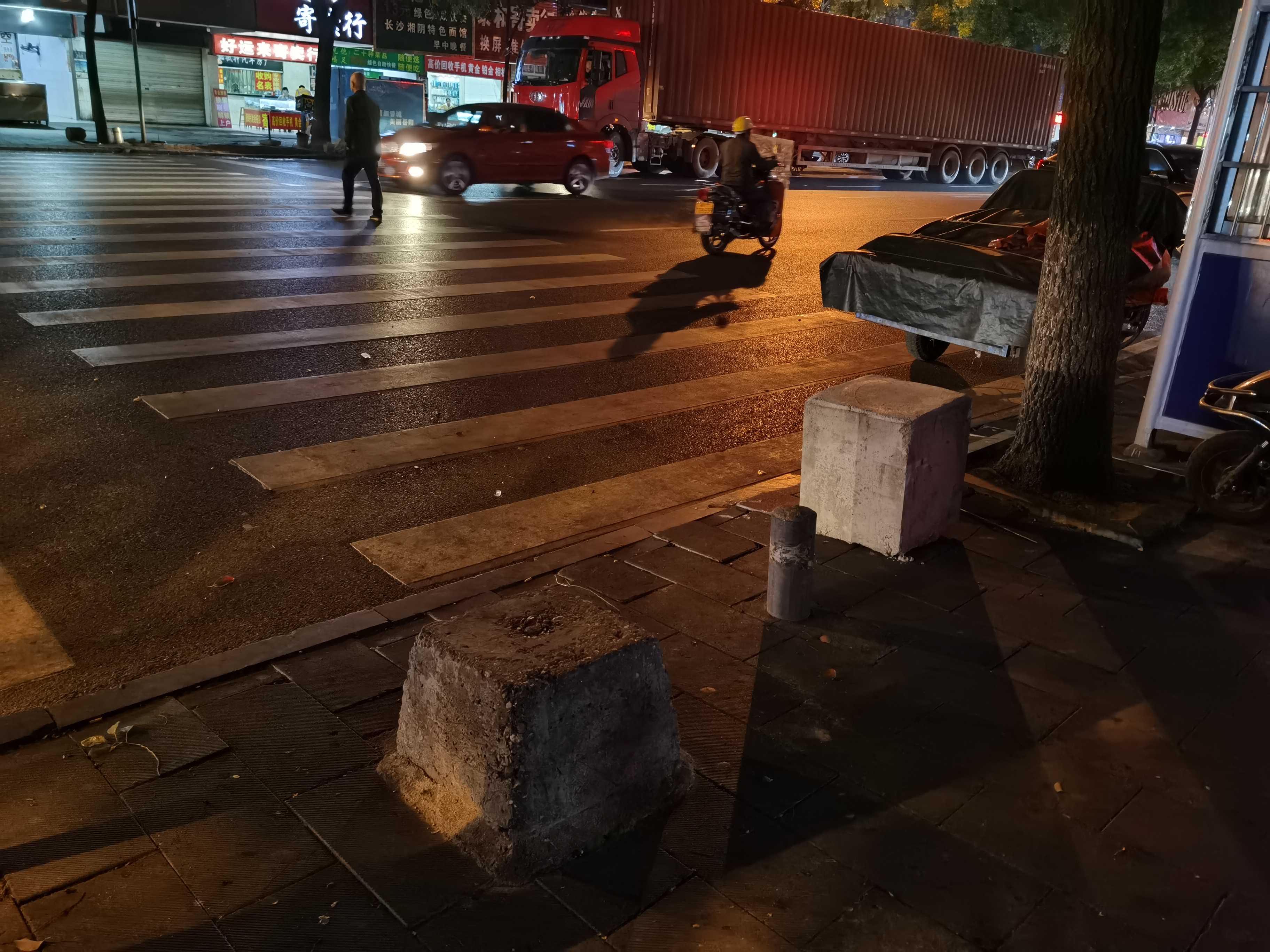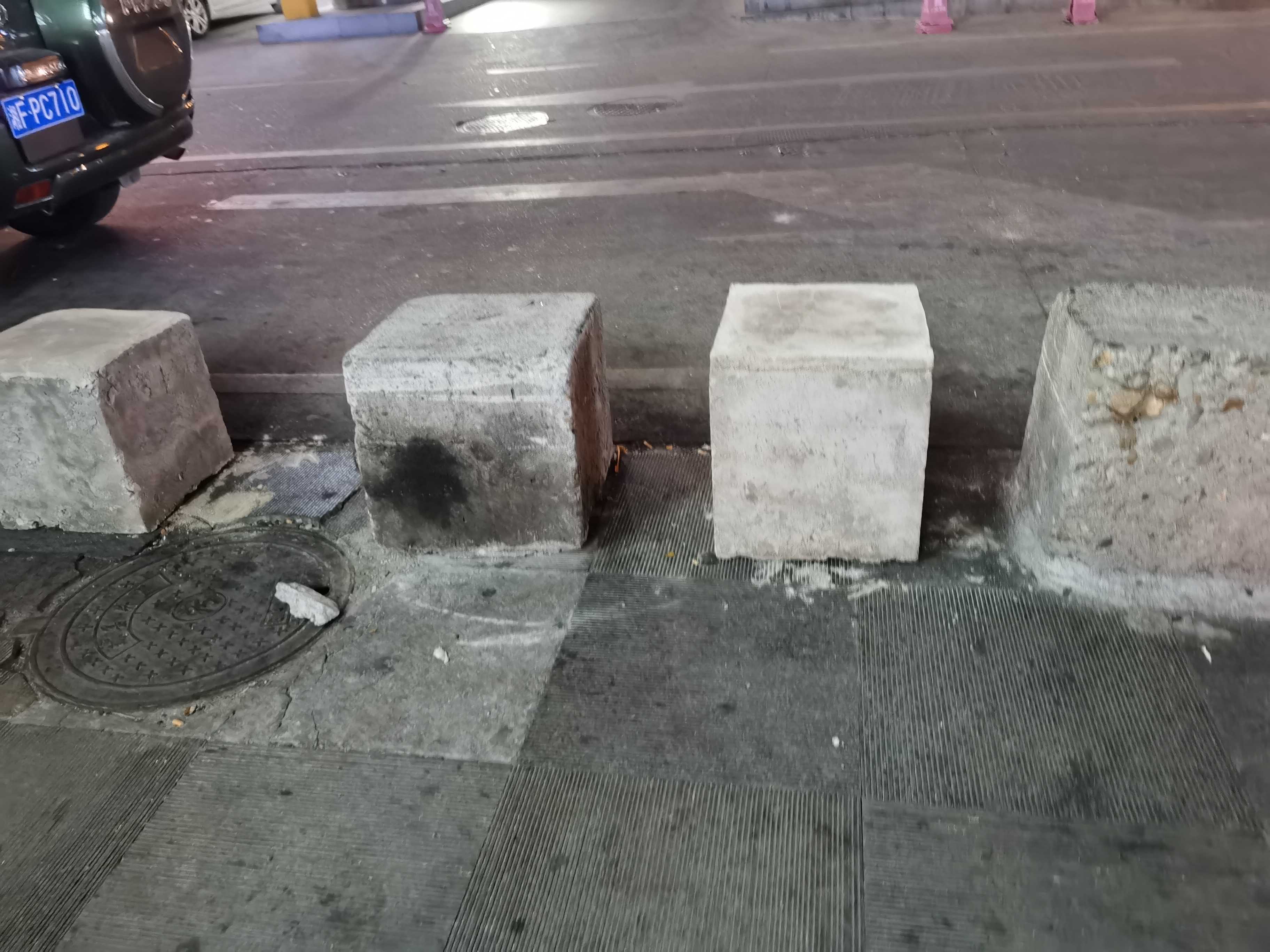 经过火车站对面的金竹街,发现盲道被堵,斑马线被栏断,一条盲道被巨型石墩子和生锈的广告牌两头堵住,斑马线临街道边被数个石墩加铁栏杆锁住,另外一条斑马线行人走过被一辆小面包车一堵了,路摊商贩说这辆车己停放多年,车胎没气,车顶上还装有一空调设备,是辆报费车,系长沙至岳阳商务车喊客人员所为所用。 报费车装空调/石墩子加铁杆装锁停放占用街道和人行道,火车站前行人之多,路人怨声一片……