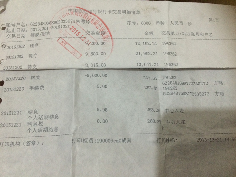 误汇钱给湖南省平江县木金乡保全村7号“方略” 亲爱的岳阳市市长大人: 您好! 初次见面,我是浙江省缙云县人朱秀玲,联系电话18358955513,现居住浙江省金华市永康市古山镇四村工业区下谢山39号,在永康打工。2015年12月20日15点37分,我在永康古山的“中国农业银行”打款,本想将5000块钱汇给一个朋友,因银行的ATM机功能有误,误将5000块钱打到了另一个账号(62284810987723****2,中国农业银行,方略)(我自己账号:62284803889622****1,中国农业银行,朱秀玲),经与农业银行协商,银行只肯给个电话,而方略联系电话是空号。经过我自己多方联系,最终了解到误打款对方名叫“方略”,身份证号码是43062619****94215,家庭地址是湖南省平江县木金乡保全村7号,现无法联系到方略本人,所以请市长大人帮帮忙,联系到方略本人或者家里人,要回我自己两个月的血汗钱。 感谢市长大人百忙之中抽空帮忙解决!万分感谢! 附件:打款凭条、交易明细清单。 |
