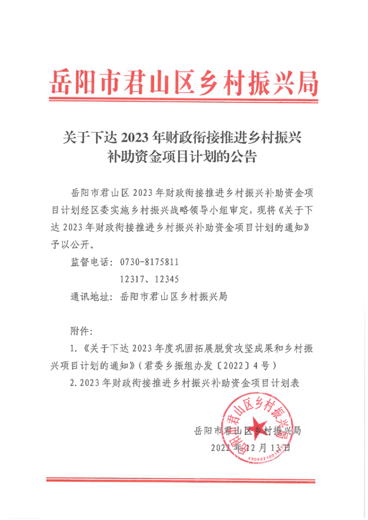 关于下达2023年财政衔接推进乡村振兴补助资金项目计划的公告