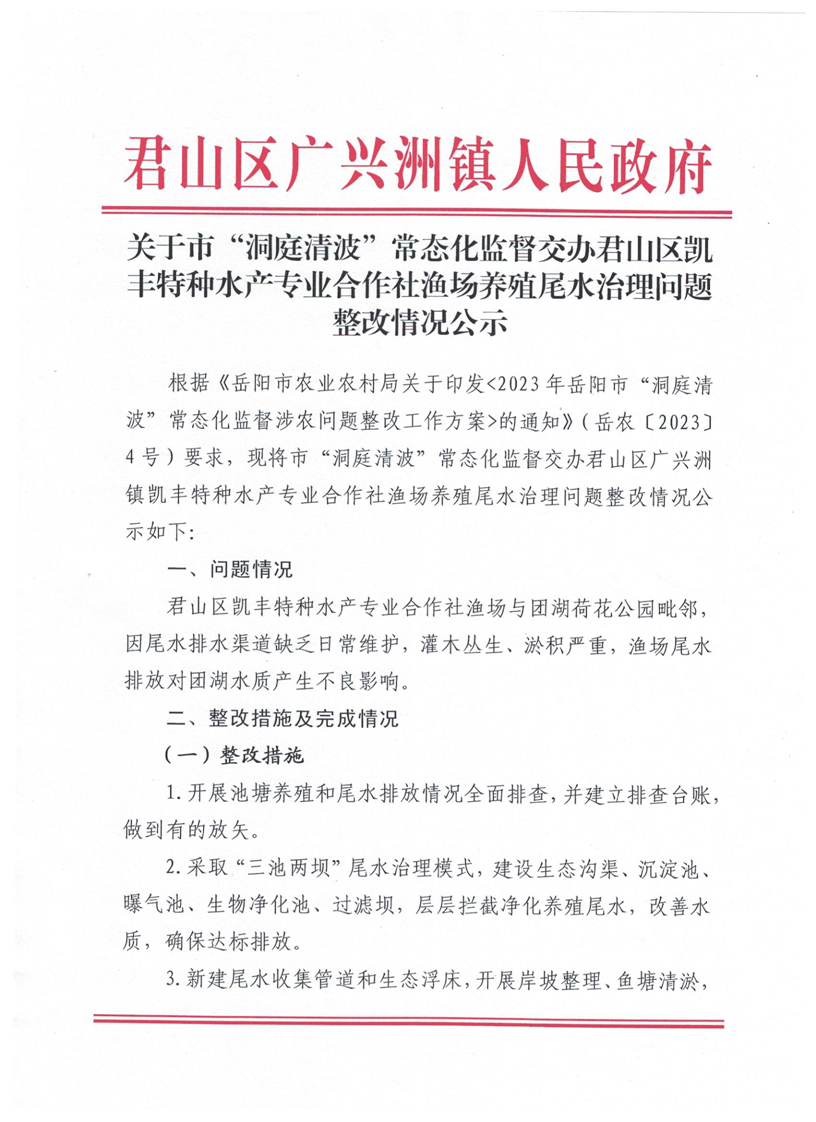 关于市“洞庭清波”常态化监督交办君山区凯丰特种水产专业合作社渔场养殖尾水治理问题整改情况公示