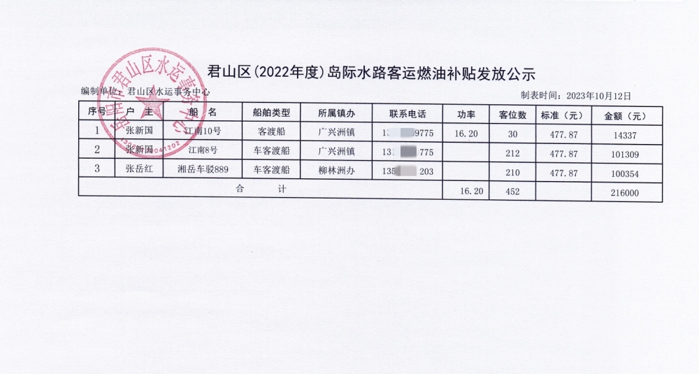 君山区(2022年度)岛际水路客运燃油补贴发放公示