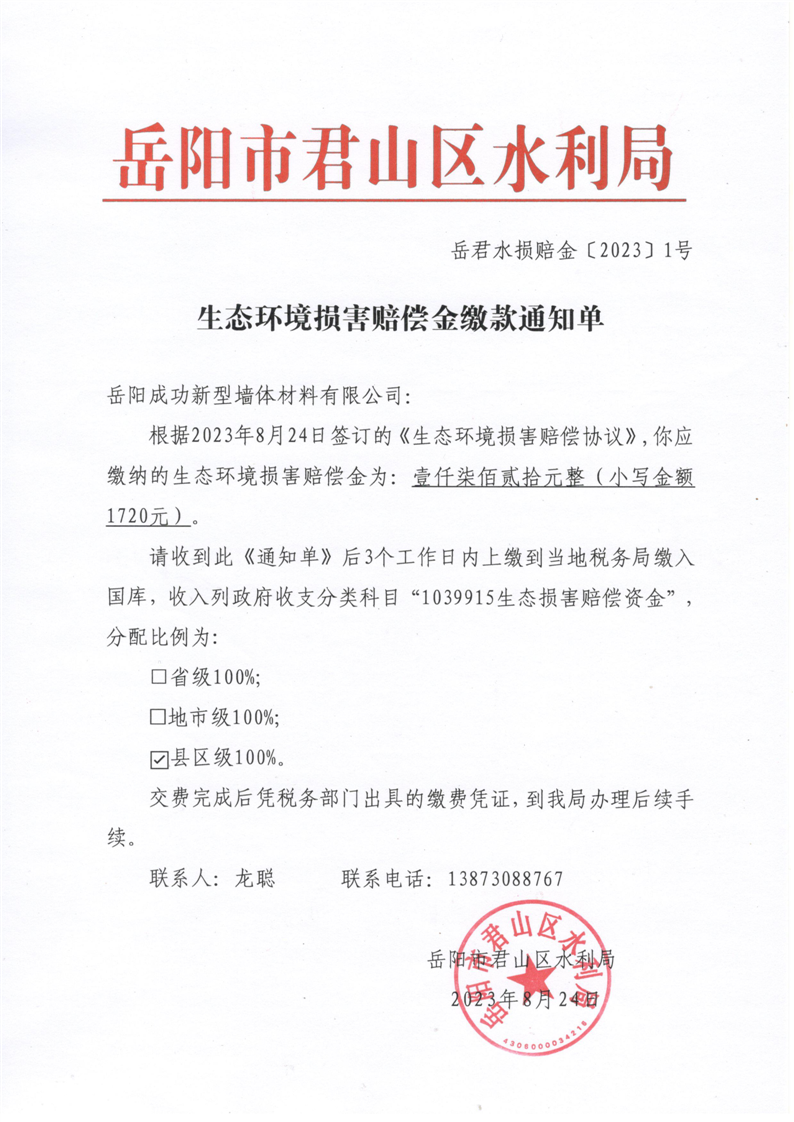 生态环境损害赔偿金缴款通知单 岳君水损赔金〔2023〕1号
