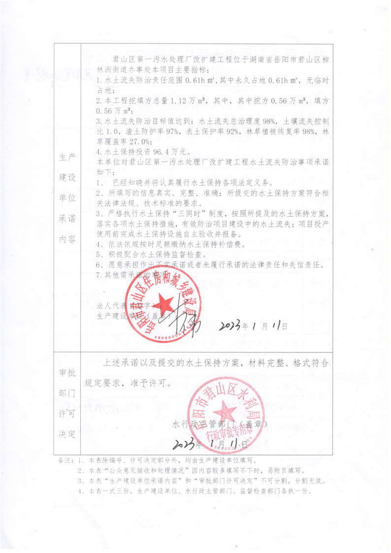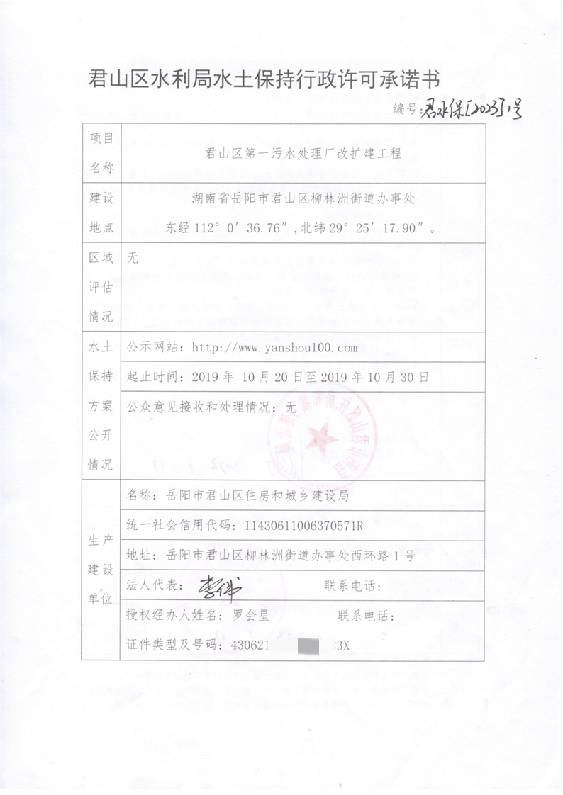 君山区水利局水土保持行政许可承诺书 君水保[2023]1号