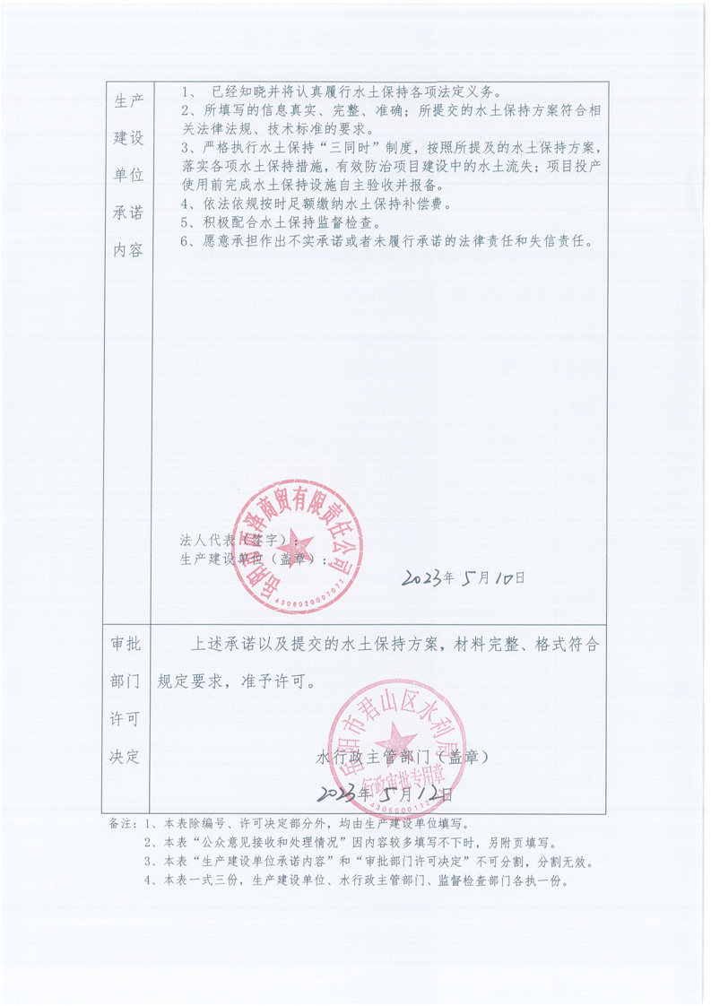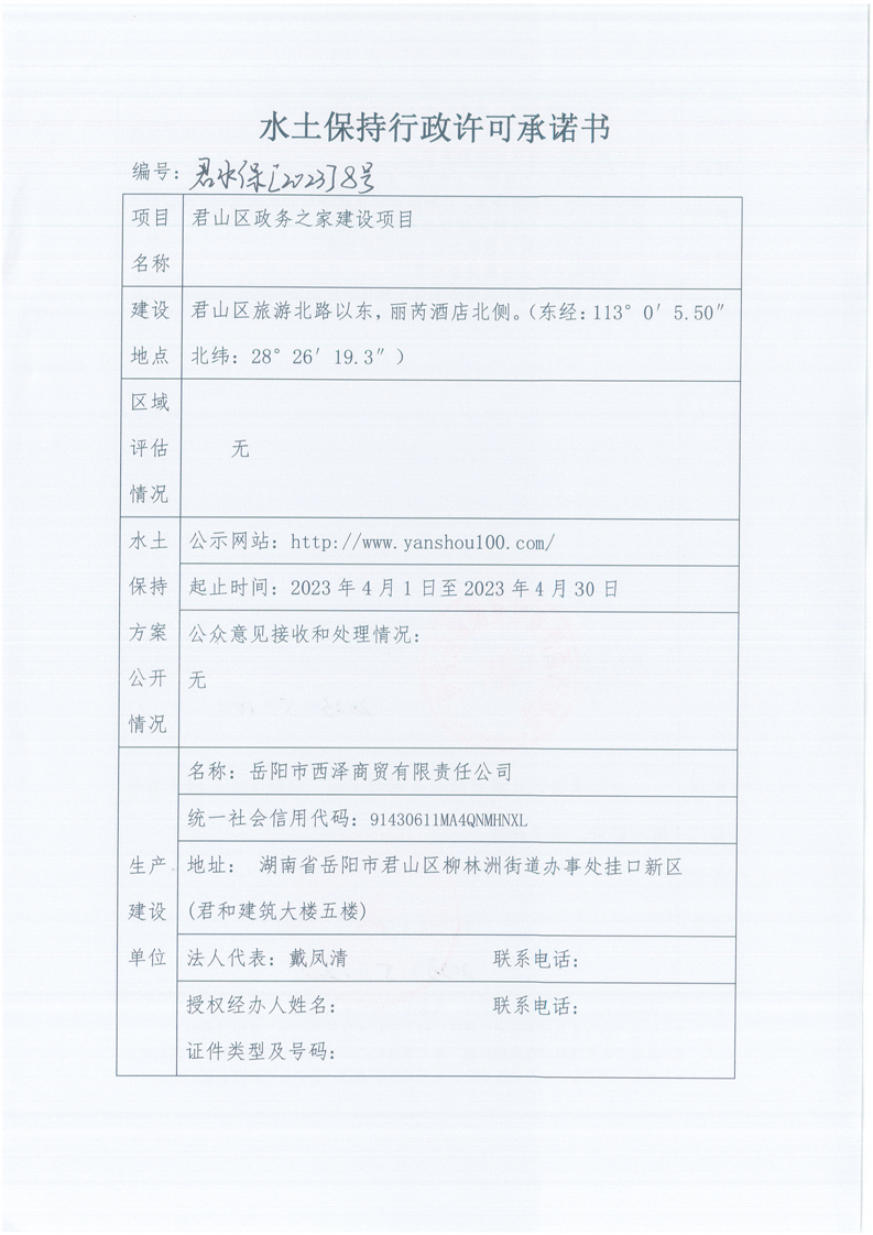 君山区水利局水土保持行政许可承诺书 君水保[2023]8号
