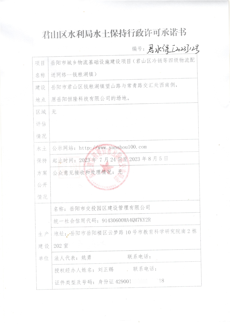 君山区水利局水土保持行政许可承诺书 君水保[2023]12号