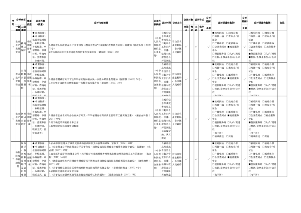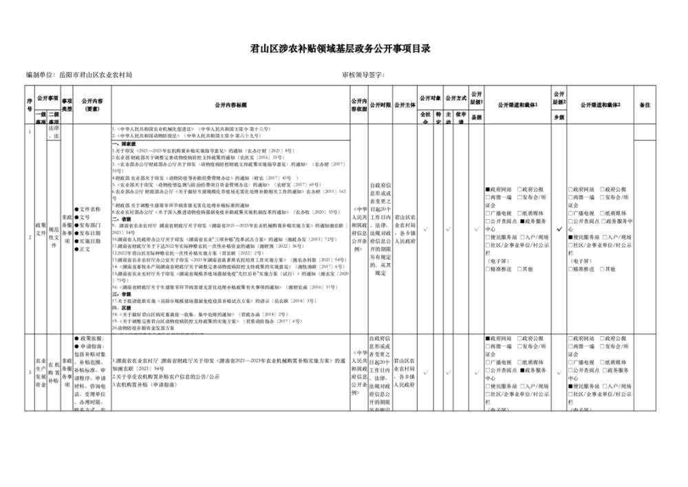 君山区涉农补贴领域基层政务公开事项目录(2025年)